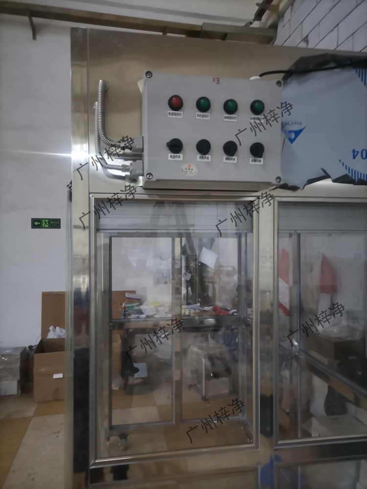防爆式風(fēng)淋室及防爆式貨淋室是一種通用性較強(qiáng)的局部?jī)艋O(shè)備,安裝于潔凈室與非潔凈室之間。當(dāng)人與貨物要進(jìn)入潔凈區(qū)時(shí)需經(jīng)風(fēng)淋室吹淋,其吹出的潔凈空氣可去除人與貨物所攜帶的塵埃,能有效的阻斷或減少塵源進(jìn)入潔凈區(qū)。對(duì)于大型進(jìn)出的產(chǎn)品貨物的風(fēng)淋室又稱為貨淋室;而貨淋室由于進(jìn)出貨物繁雜,設(shè)備運(yùn)行時(shí)處于高功率運(yùn)行的工作,貨淋室需要具備的一定的防爆功能,現(xiàn)有技術(shù)中貨淋室防爆主要針對(duì)貨淋室箱體保護(hù)較多,針對(duì)貨淋室中及其引發(fā)故障的電路系統(tǒng)的防爆保護(hù)不足,尤其是控制電箱防爆保護(hù)程度不高。